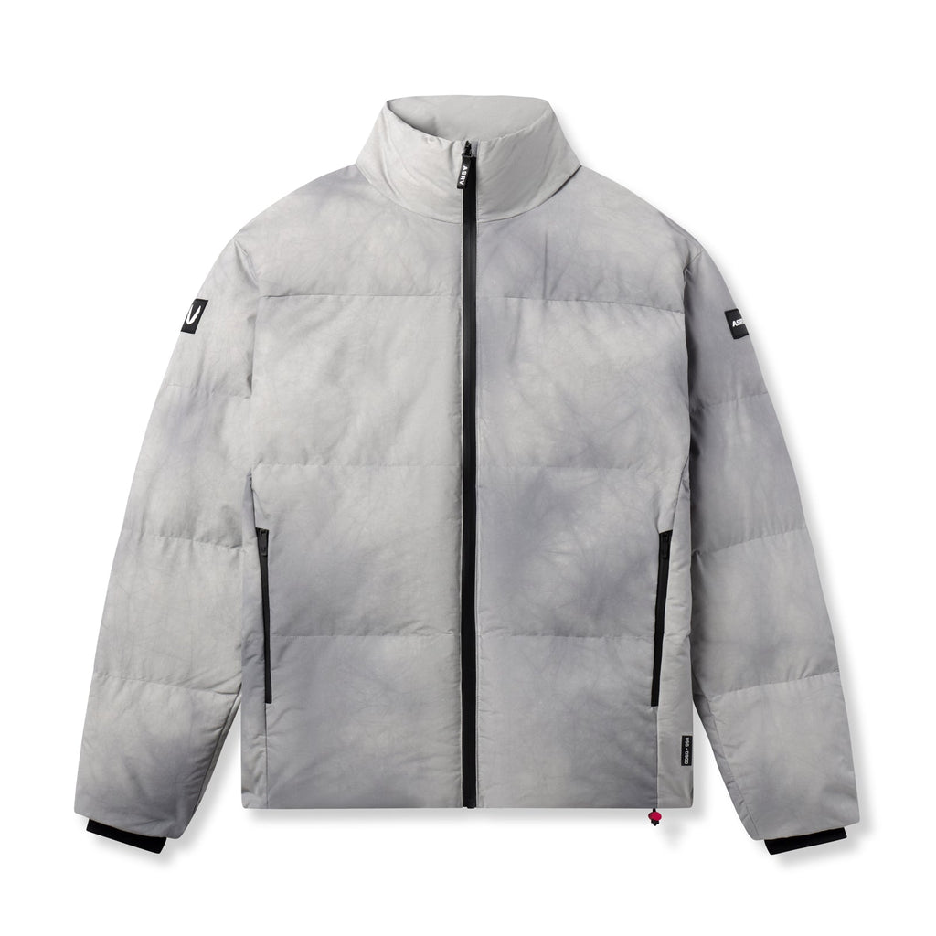 Now upgraded with PrimaLoft® RISE 3014 / 200g insulation and Oeko-Tex® 100 certification, the durable outer shell offers water resistance for superior elemental protection and showcases a unique, one-of-a-kind wave-dye pattern on every garment. This jacket provides exceptional warmth with its high-neck design, internal adjustable cinch waist hem, and ultra-soft hidden Warpflexx™ sleeve cuffs. Two soft napped fleece-lined hand pockets offer secure storage with waterproof zipper closures. Wrapped waist and sleeve hems contribute to a clean, minimalist aesthetic. Inlaid rubber patches on each sleeve feature reflective embroidery, while an internal hanging loop adds convenience.